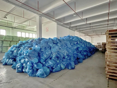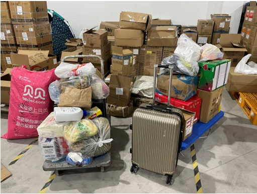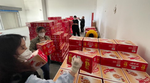 这批物资包装方式比较简单,到货时,多数包装已经破损,只能人工把重新分拣包装,罗文东从此变成了“袋”王,每天解决数以千计的“七天大礼包”,蓝色包装堆叠成了“袋”山。