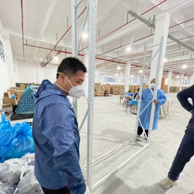 听说方舱医护人员更衣间不足后,物资保障组立即拿出存放贵重物资的仓储货架,搭建成临时衣帽间,供医疗人员使用。