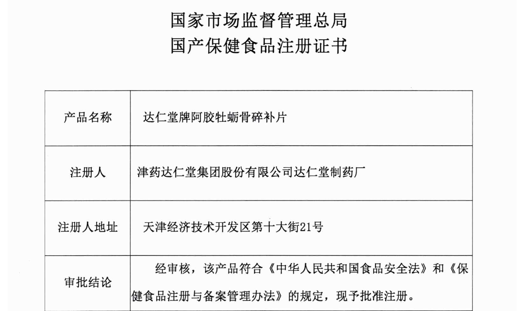 达仁堂制药厂取得两项国产保健食品注册证书